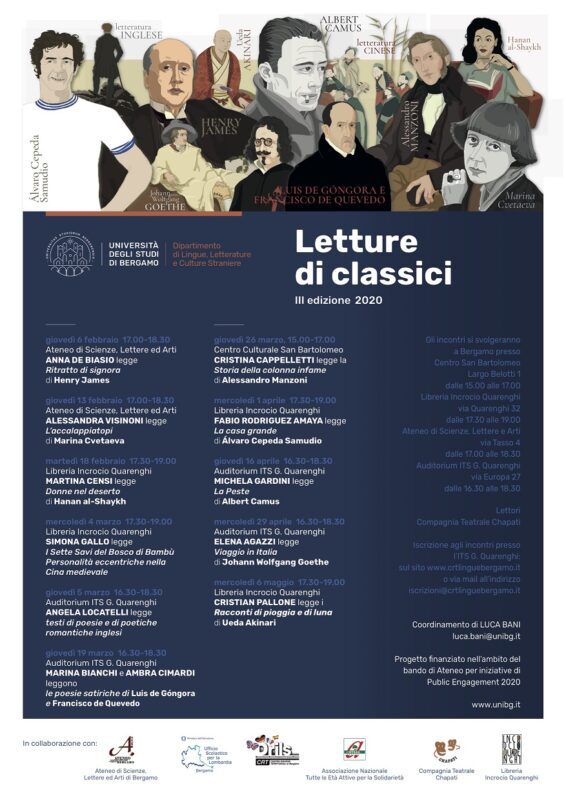 Al via la terza edizione del ciclo “Letture dei classici”, undici appuntamenti gratuiti a cura dei docenti del Dipartimento di Lingue, Letterature e Culture Straniere dell’Università degli studi di Bergamo, in collaborazione con l’Ateneo di Scienze, Lettere e Arti, la Libreria Incrocio Quarenghi, l’Anteas e l’Ufficio Scolastico Territoriale, che vuole presentare alla città, ai docenti e agli studenti delle scuole superiori le grandi opere delle letterature insegnate nel Dipartimento.