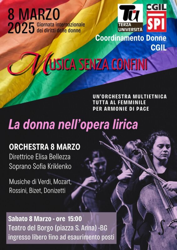 Sabato 8 marzo, alle 15.00, il Teatro del Borgo (Piazza Sant’Anna, Bergamo) ospiterà il concerto “La donna nell’opera lirica”, con l’Orchestra 8 Marzo, diretta da Elisa Bellezza, e il soprano Sofia Kriklenko. Attraverso le arie più celebri della tradizione operistica, l’evento metterà in evidenza il ruolo della donna nell’immaginario culturale: troppo spesso relegata a vittima o a figura secondaria, ma in realtà centrale nella narrazione e nella lotta contro le ingiustizie. Il concerto sarà anche un messaggio di pace e inclusione, con un’orchestra tutta al femminile composta da musiciste di diverse nazionalità. L’ingresso è gratuito, con offerta libera a sostegno di donne in difficoltà.