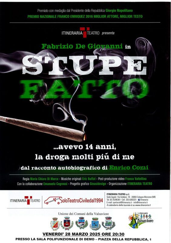 L’Unione dei Comuni della Valsaviore organizza un’importante serata di sensibilizzazione con lo spettacolo teatrale “Stupefatto”, in programma venerdì 28 marzo alle ore 20.30 presso la sala polifunzionale di Berzo Demo.