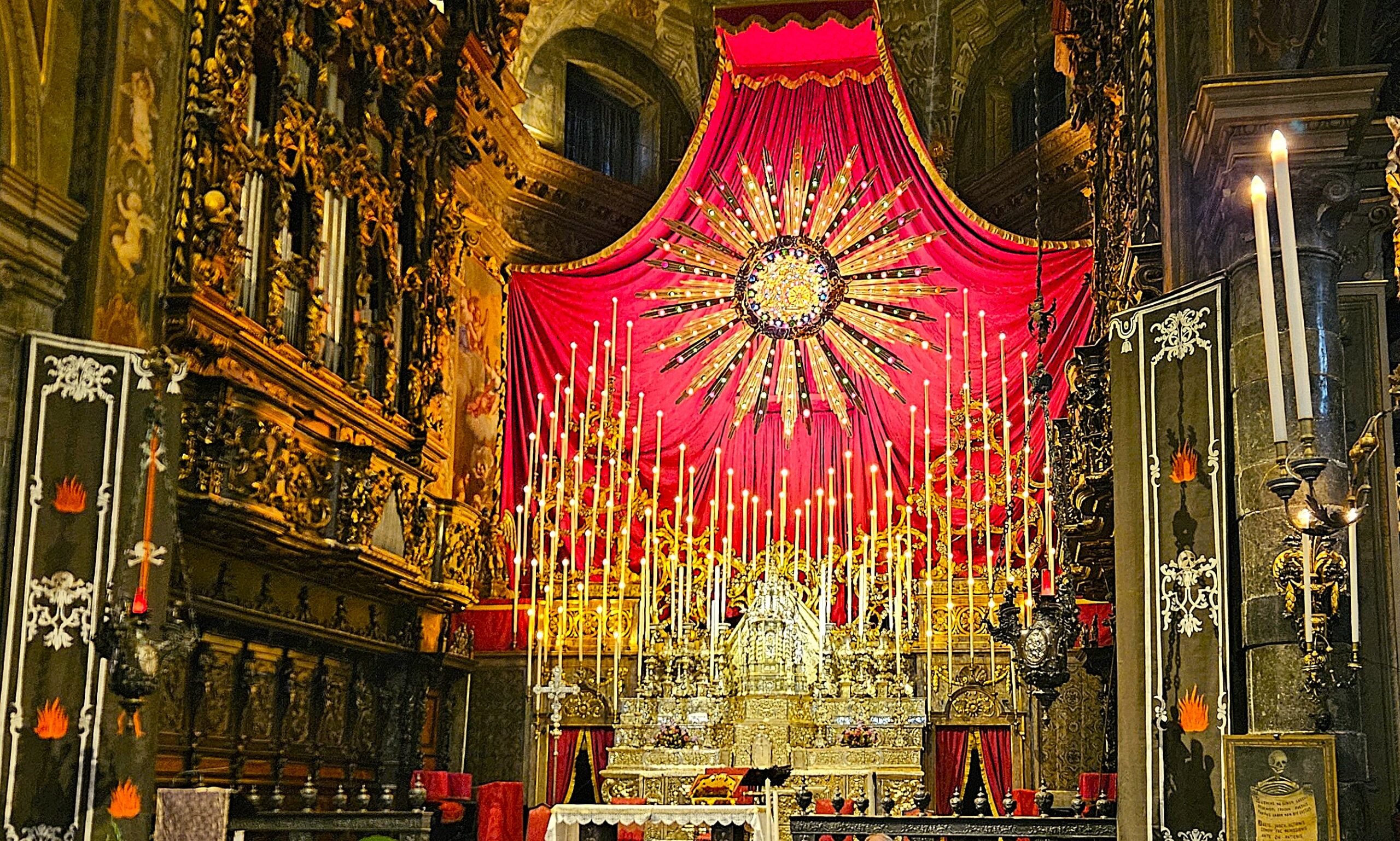 Sarà ancora una volta l’imponente e suggestiva Raggiera dei maestri Caniana a caratterizzare a Gandino il Sacro Triduo dei Morti in programma nella Basilica di Saria Assunta da sabato 28 febbraio a lunedì 2 marzo 2026. In un grandioso allestimento si fondono la devozione plurisecolare di una comunità e i riti legati alle giornate quaresimali dedicate ai defunti.A dominare l’imponente struttura della chiesa è come detto la Raggiera lignea che si erge dietro l’altare maggiore. Fu realizzata dalla bottega dei maestri Caniana, fra il 1788 ed il 1791, dopo che quella creata nel 1777 da Donato Andrea Fantoni fu ritenuta non sufficientemente maestosa. L’enorme incastellatura tocca i dodici metri di altezza e vede il Santissimo coronato da raggi con vetri policromi di Murano illuminati da lampadine elettriche (un tempo lumini) secondo un’iconografia che richiama la visione dantesca di Dio. Ha un corpo centrale del diametro di cinque metri con quattro cerchi concentrici, fissato sopra l’altare maggiore. Ad esso si aggiungono le piramidi, bracci lignei che reggono 116 candele. Il tutto avvolto in un enorme drappo cremisi frutto della tradizione tessile della Val Gandino.Le celebrazioni iniziano sabato 28 febbraio alle 8 alle 10.30 quando saranno celebrate le funzioni liturgiche di apertura. Le celebrazioni, animate dalle riflessioni di mons. Davide Pelucchi vicario generale della Diocesi, si protrarranno sino a lunedì 2 marzo, quando alle 10.30 la concelebrazione in Basilica riunirà sacerdoti nativi, della Fraternità e che hanno prestato servizio a Gandino. Domenica e lunedì, alle 15, sono in programma le solenni funzioni pomeridiane, accompagnate (come le messe) dalla Corale Luigi Canali, diretta da Marco Guerinoni e accompagnata all’organo da Tobia Sonzogni. Visite guidate alla “macchina del Triduo” curate dagli Amici del Museo della Basilica sono in programma sabato 28 febbraio alle 16, domenica 1 marzo alle 11.30 e alle 16.15, lunedì 2 marzo alle 16.15 sempre al termine delle liturgie. Da ricordare anche il concerto vocale e strumentale di Venerdì 27 febbraio alle 20.30 dedicato al grande organista Vincenzo Petrali del quale verrà presentata la monografia opera di Diego Ambrosioni e Aldo Salvagno. Programmi completi su www.lecinqueterredellavalgandino.it