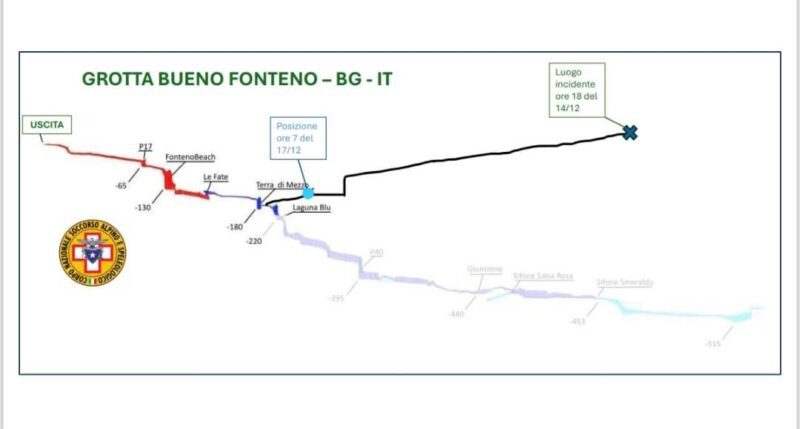 I soccorritori con la barella hanno terminato il percorso nel ramo secondario della grotta – non esplorato – per ora ritrovarsi nella parte conosciuta della grotta. Da qui occorrono circa 2 ore per giungere al ramo principale, e altri 30 minuti per giungere all’uscita. Le suddette 2 ore e 30 minuti sono le tempistiche di uscita in condizioni normali. Le effettive tempistiche di uscita, in queste condizioni, sono di circa 36/48 ore, scandite da un’ora e mezza di trasporto e un’ora di pausa per fornire assistenza sanitaria all’infortunata. Fino a questo momento sono stati impegnati 126 tecnici del Soccorso Alpino e Speleologico che hanno formato 5 squadre di soccorso: alcune dedicate al trasporto della barella, altre ad anticiparne il passaggio provvedendo a disostruire dei tratti che successivamente potrebbero risultare problematici – anche con l’utilizzo di piccole cariche esplosive. L’ingresso della sesta squadra è previsto per questa sera, quello della settima nella giornata di domani. I tecnici sono provenienti da Lombardia, Campania, Emilia-Romagna, Friuli-Venezia Giulia, Lazio, Liguria, Marche, Piemonte, Trentino-Alto Adige, Toscana, Umbria e Veneto. È previsto l’arrivo di ulteriore personale dalla Sardegna.