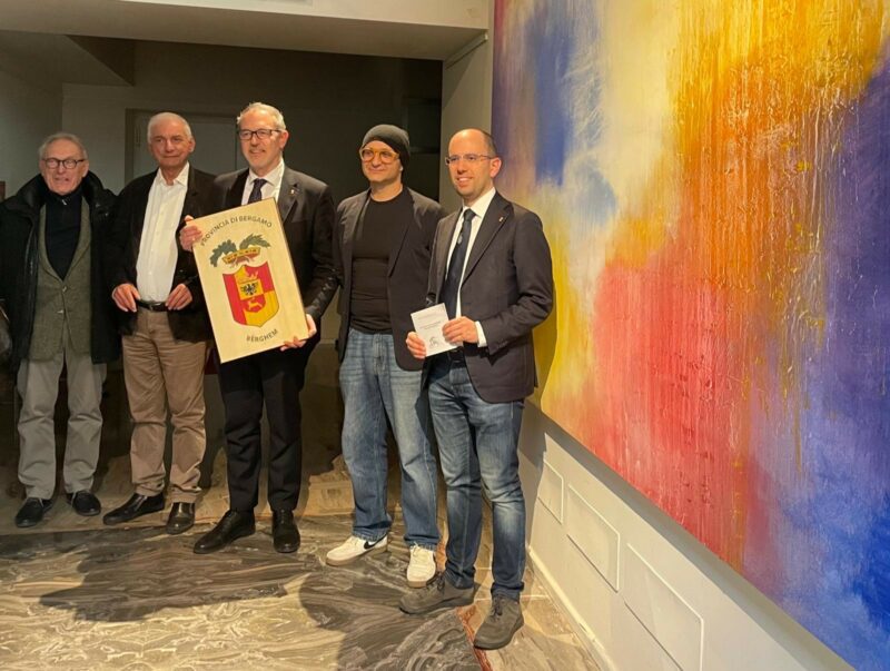 L’artista Manuel Bonfanti dona “Air Space”, tela di 3 metri per 2 realizzata con tecnica mista nel 2019, alla Provincia di Bergamo, nello Spazio Viterbi, l’area espositiva frutto di un accurato recupero del sottotetto del Palazzo di Via Tasso intitolato allo scienziato di origine bergamasche Andrea Viterbi, “padre” della telefonia cellulare. La donazione, con consegna al presidente della Provincia di Bergamo Pasquale Gandolfi e al vicepresidente Matteo Macoli, avviene in occasione della chiusura della mostra “10+ Modern Art”, allestita nello Spazio Viterbi fino a domani, 30 gennaio. La collettiva, a cura di Sergio Radici e Anny Lazzari, espone le opere di 10 artisti bergamaschi e 10 artisti veneziani nell’ottica di un gemellaggio tra le due terre (la mostra si trasferirà infatti dal 3 al 16 febbraio a Venezia, nella chiesa di San Leonardo). Esposti dipinti e sculture di: Maurizio Azzolini, Sergio Battarola, Cesare Benaglia, Giovanna Bolognini, Manuel Bonfanti, Raffaele Bovo, Giuseppe Coppola, Giancarlo Defendi, Giulia Enzo, Tiziano Finazzi, Barbara Furlan, Claudio Granaroli, Daniela Lazzari, Margherita Leoni, Ugo Riva, Katia Scotti, Arturo Siebessi, Silvia Stocchetto, Alessandro Verdi e Sergio Vozza.