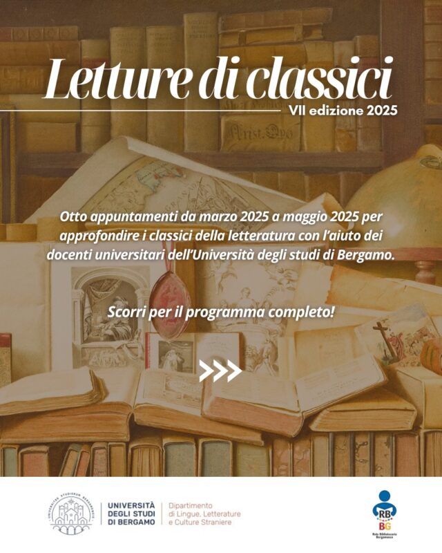 Nell’ambito delle attività di Public Engagement dell’Università degli studi di Bergamo, Paolo Barcella e Cristina Cappelletti del Dipartimento di Lingue, Letterature e Culture Straniere organizzano, per l’anno 2025, una nuova serie di incontri dedicati alle Letture di Classici, giunta quest’anno alla VII edizione.