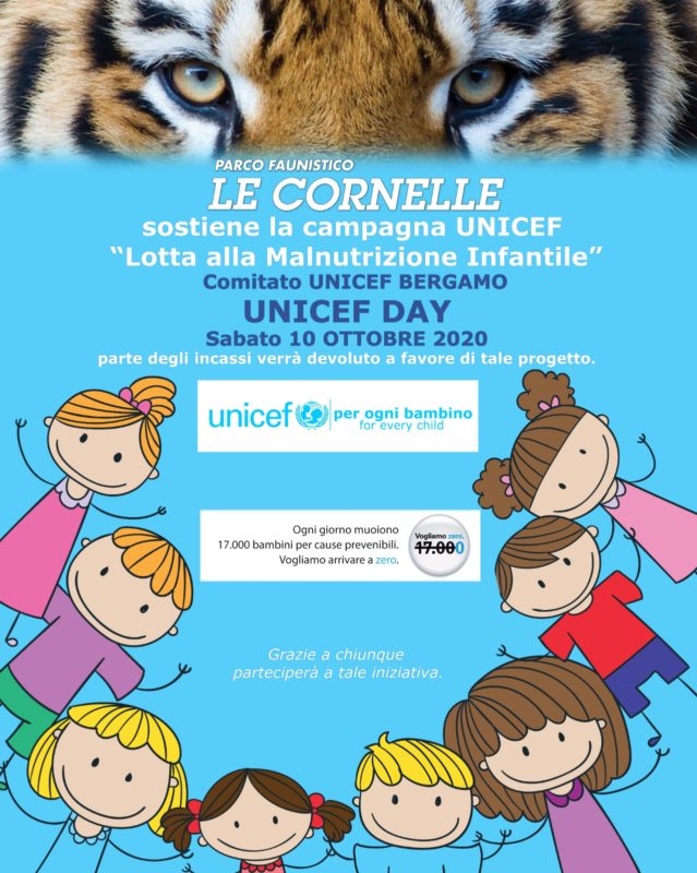 06 Ottobre 2020 – Anche quest’anno il Parco, da sempre attento ai più piccoli, sostiene UNICEF e i suoi progetti a tutela dei bambini più vulnerabili e bisognosi d’aiuto. In occasione dell’UNICEF DAY, sabato 10 ottobre, il Parco Faunistico Le Cornelle, devolverà parte degli incassi a favore della campagna “Lotta contro la Malnutrizione Infantile”.
