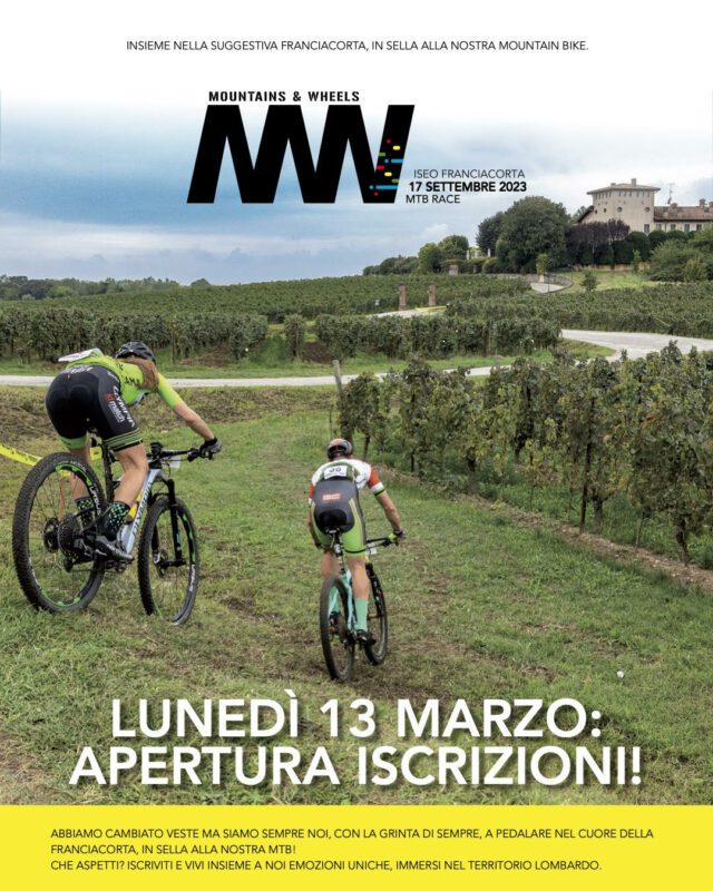 A partire da lunedì 13 marzo, saranno ufficialmente aperte le iscrizioni per la gara MTB, Mountains & Wheels Bike Internazionale, che si terrà a Iseo (Bs), in Franciacorta, il 17 settembre 2023. La gara presenta un percorso di 47,5 km che interesserà la nuova Ciclovia Bergamo-Brescia, permettendo ai partecipanti di godere di un’esperienza immersiva nel paesaggio culturale tra le due Capitali della Cultura 2023, Bergamo e Brescia. Le iscrizioni saranno aperte sia online sul sito ufficiale della manifestazione www.mwbike.it, dove saranno disponibili tutte le informazioni necessarie per la procedura di iscrizione, sia presso gli uffici organizzativi della GimaSport in Via G. Da Campione, 24/c – 24124 Bergamo (tel. +39 035.211721).