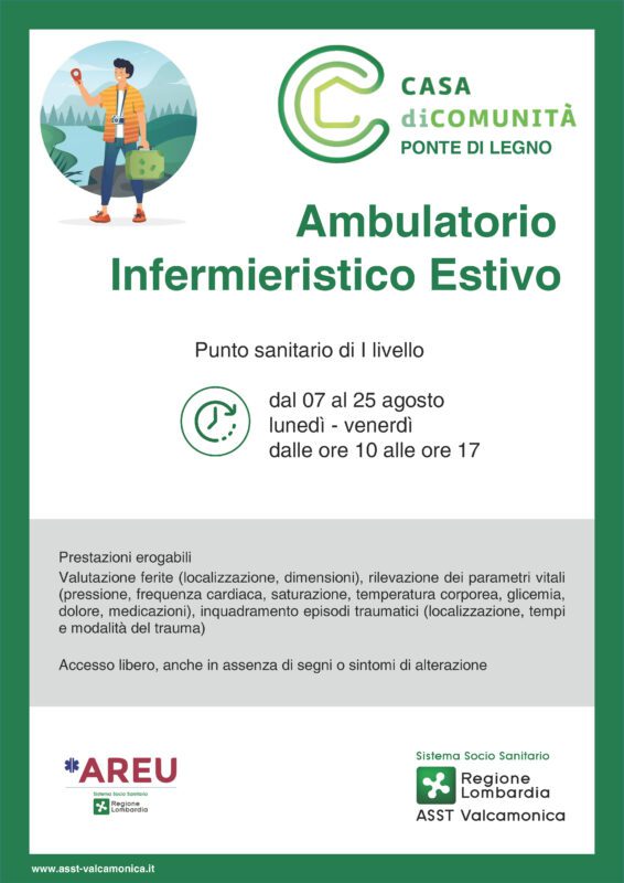 Lunedì 07 agosto alle ore 11.30, presso la Casa di Comunità di Ponte di Legno (Piazzale Europa, 14), l’ASST della Valcamonica illustrerà l’attività dell’Ambulatorio Infermieristico Estivo, che sarà aperto dal 07 al 25 agosto. Saranno presenti all’apertura la Dr.ssa Giuseppina Barcellini – Direttore Distretto ASST della Valcamonica, la Dr.ssa Giuliana Zanini – Direttore SC DAPSS (Direzione Aziendale delle Professioni Sanitarie e Sociosanitarie), la Coordinatrice Infermieristica Patrizia Laffranchini e l’Infermiera di Famiglia e di Comunità Giacomina Macri. Interverrà anche il Pro Sindaco di Ponte di Legno, Sig.ra Virginia Carettoni.