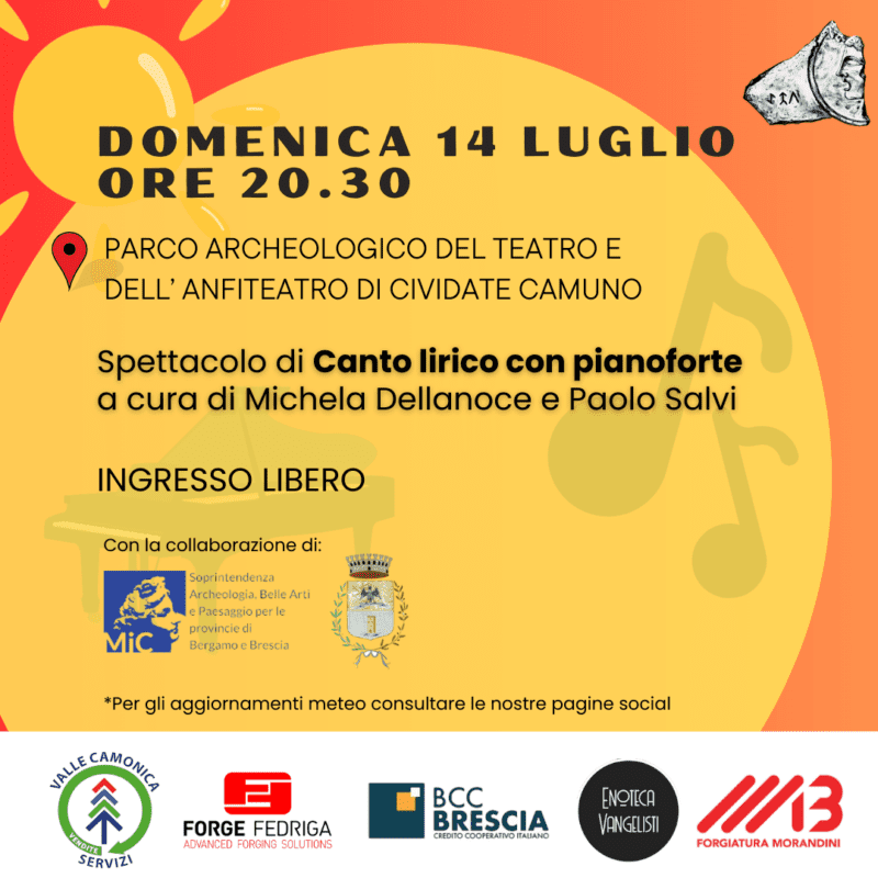 Spettacolo di Canto Lirico con accompagnamento del Pianoforte nel contesto unico dell’Anfiteatro Romano. L’evento si tiene domenica 14 luglio dalle ore 20.30 con una durata prevista di un’ora, presso il Parco Archeologico del Teatro e dell’Anfiteatro romano di Cividate Camuno. L’entrata nel Parco è libera