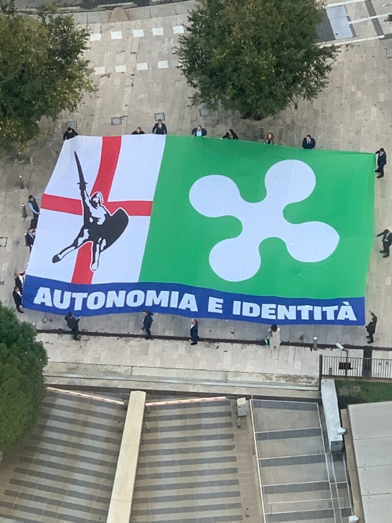 A otto anni dal referendum per l’autonomia del 22 ottobre 2017, la Lega ha celebrato l’anniversario con un flash mob davanti a Palazzo Pirelli, sede del Consiglio regionale della Lombardia, srotolando un bandierone da 150 metri quadrati con i simboli della Lombardia e la scritta ‘Autonomia e Identità’.