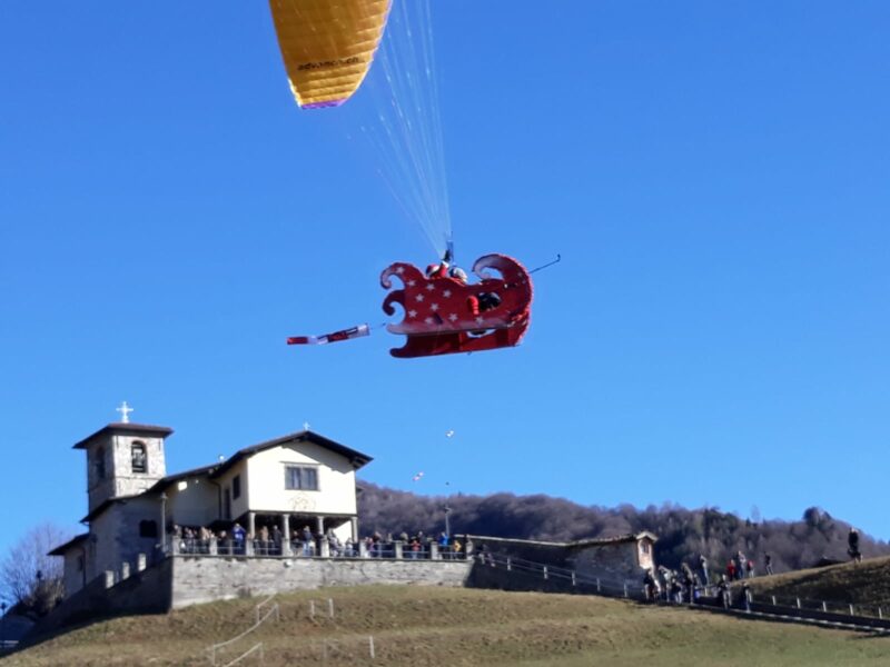 La vecchina ed i “Babbi Natale” suoi assistenti hanno solcato in parapendio i cieli della frazione, disegnando cerchi augurali con l’ausilio di alcuni fumogeni.