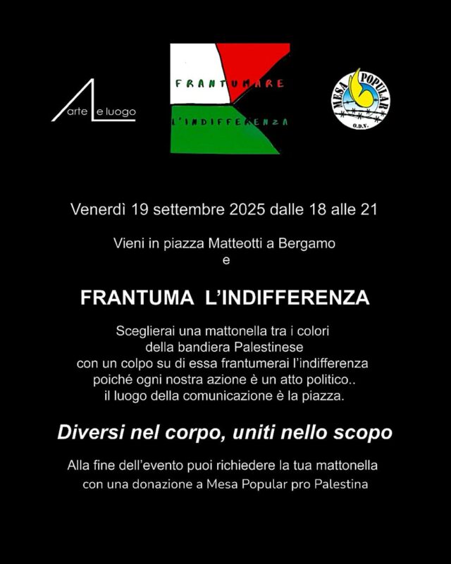 BERGAMO – Venerdì 19 settembre, in piazza Matteotti davanti al palazzo comunale, si terrà la manifestazione “Frantumare l’indifferenza”, all’interno del presidio permanente a sostegno della Global Sumud Flotilla. L’iniziativa è organizzata dall’Associazione Mesa Popular ODV di Bergamo e dal Movimento Le Veglie contro le morti in mare.