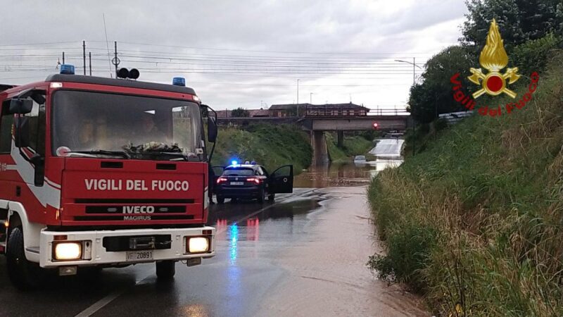 I Vigili del fuoco volontari di Romano di Lombardia intervengono a Cortenuova SP99 nel sottopasso, FS Milano/Venezia intorno alle 20:14 per soccorrere due persone che erano rimaste bloccate con la loro vettura a causa dell’allagamento.