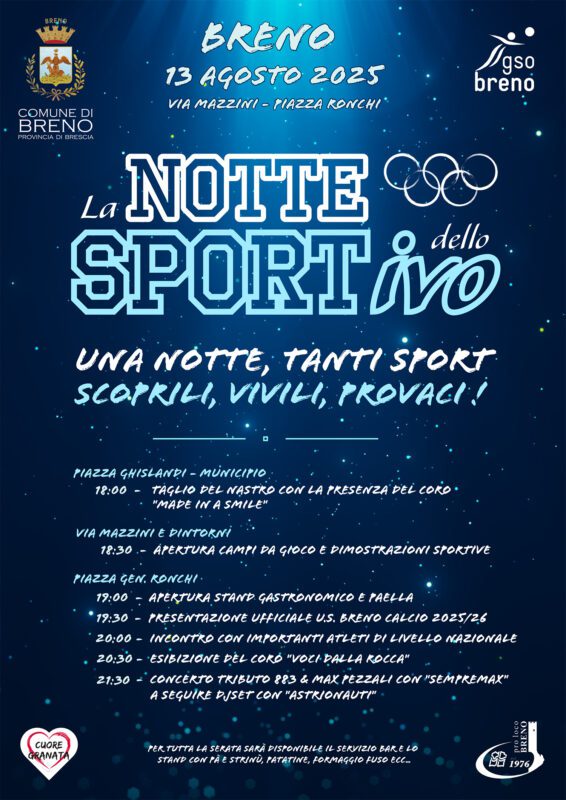 Il 13 agosto è in programma la prima edizione della Notte dello Sportivo, una serata/notte ricca di sport per le vie del paese, dove bambini e ragazzi, con le loro famiglie, potranno cimentarsi nelle varie attività sportive proposte. Il programma prevede l’inaugurazione con taglio del nastro da parte delle autorità alle 18:00 in piazza Ghislandi, alla presenza del Coro Made in a Smile. I giochi e gli allestimenti relativi alle varie attività sportive si troveranno lungo tutta via Mazzini, che per l’occasione verrà chiusa al traffico. Qui ci si potrà cimentare in volley, basket, calcio, tennis, ping-pong, arrampicata, scacchi, atletica, bici e molto altro. La maggior parte degli sport saranno presentati e gestiti dal GSO, Gruppo Sportivo Oratorio, che fa riferimento all’oratorio San Valentino di Breno ed è presieduto da Valentina Ducoli. L’intento è quello di promuovere l’attività sportiva soprattutto tra i bambini e ragazzi e di far conoscere le numerose realtà e società del territorio. Nella stessa serata il cuore della festa sarà la piazza Mercato: lo stand gastronomico aprirà alle 19:00, a cura degli Amici del Cuore Granata (menù su prenotazione: paella), ma già dalle 18:00 verranno serviti aperitivi a cura dell’Asd Pape di Pescarzo. Alle 19:30 si presenterà pubblicamente l’Us Breno al completo: il nuovo presidente Dario Domenighini e tutto il direttivo, i riconfermati ds Andrea Foresta e mister Davide Bersi, la rinnovata rosa della prima squadra, che giocherà nel girone B del campionato di Serie D, e i vari tecnici. Il palco verrà poi occupato dal Coro Voci dalla Rocca di Breno, dalle 20:00. Dopo l’intermezzo musicale sono attesi una serie di ospiti che il Comune di Breno e il GSO di Breno hanno voluto invitare per arricchire la serata. Racconteranno le loro imprese e spiegheranno quanto conta nella loro vita lo sport. Ecco l’elenco degli atleti: Steve Holcombe, inglese, nove volte campione mondiale di enduro; Maurizio Micheluz, più volte campione europeo e italiano di enduro; Francesca Nocera, campionessa italiana ed europea di enduro; Nadia Fanchini, camuna, sciatrice delle Fiamme gialle medagliata più volte ai mondiali di sci e a podio in coppa del mondo; Cristian Marioli, camuno, Campione Italiano di Mini Enduro. Mirko Pedretti, camuno, Campione europeo trial; Sergio Cruz Pereira, brasiliano, residente ad Angolo Terme, calciatore vincitore del Pallone d’Oro Tik Tok Italia, La festa in Piazza Mercato proseguirà con il concerto della tribute band 883 & Max Pezzali “SempreMax” dalle 21:30 e, a seguire, con la musica dance degli “Astrionauti”. L’Asd Pape di Pescarzo si occuperà dei cocktail. Saranno presenti anche il Pullman Azzurro della Polizia di Stato, dal quale i poliziotti della Stradale di Darfo daranno lezioni di sicurezza stradale, e le auto d’epoca di Nostalgia Club di Breno con tutto il loro fascino. “Siamo contenti che a Breno esistano così tante realtà legate allo sport, le vogliamo far conoscere attraverso questo evento, del tutto nuovo, che trasformerà il centro del paese in una grande palestra a cielo aperto. Un progetto a cui teniamo molto, che sta impegnando tante persone e che si inserisce all’interno del classico programma del Ferragosto brenese. Buon segno anche il fatto che la società calcistica del Breno abbia deciso di tornare in piazza a presentarsi, dimostrando attaccamento al paese che rappresenta.” dichiara il vicesindaco con delega allo sport Luca Salvetti invitando tutti a Breno per il 13 agosto.