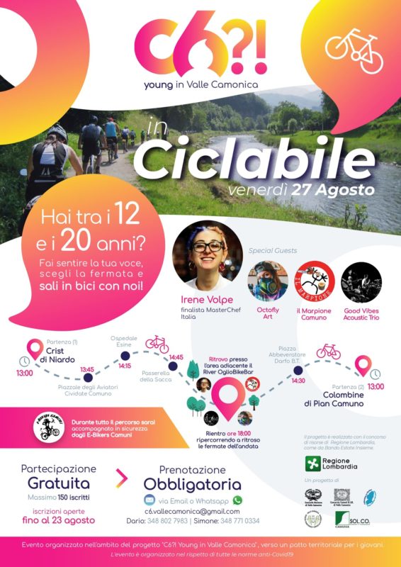 L’arrivo delle due carovane di biciclette è previsto attorno alle h15: i ragazzi si fermeranno per le attività fino alle h18 ca., per formare nuovamente i due gruppi di partenza e procedere a ritroso lungo le fermate fino a Niardo (per chi risale la valle) e a Pian Camuno (per chi la scende). Sia all’andata che al ritorno, i partecipanti saranno accompagnati sia dagli operatori del progetto C6?! Young in Valle Camonica, che dal gruppo degli Ebikers Camuni.