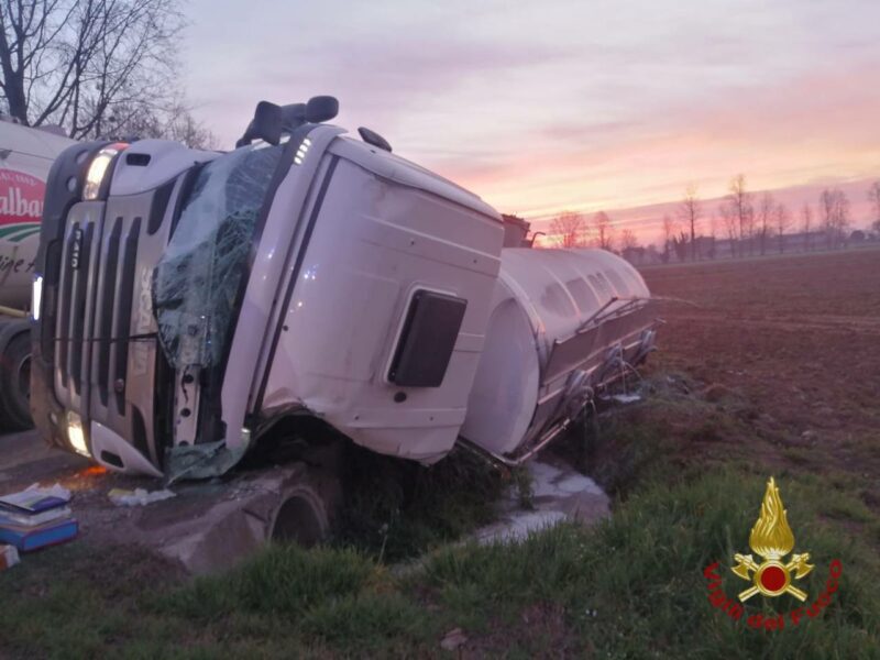 I Vigili del Fuoco del distaccamento volontario di Romano di Lombardia sono stati chiamati ad intervenire in seguito ad un incidente stradale verificatosi a Pumenengo, in via Fontanella, intorno alle 5:47 del mattino. Secondo le prime informazioni, un uomo alla guida di un camion cisterna utilizzato per il trasporto del latte, ha perso il controllo del mezzo ribaltandosi fuori strada.