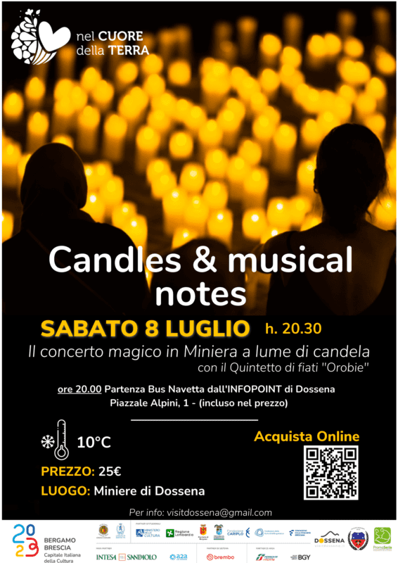 Scoprire la magia di una serata d’estate nel cuore delle Miniere di Dossena diventa realtà con il Candles and Musical Notes. Il concerto, che si terrà sabato 8 luglio alle 20:30, propone un programma capace di riportare indietro il tempo all’epoca in cui i minatori vivevano la miniera attraverso la sola luce delle candele, circa 700 per la serata. Ad aumentare la suggestione, le performance del Quintetto di fiati “Orobie” con i grandi classici dell’Opera lirica italiana, da Mozart a Donizetti, arricchiti dal commento di Bernardino Zappa, critico musicale.