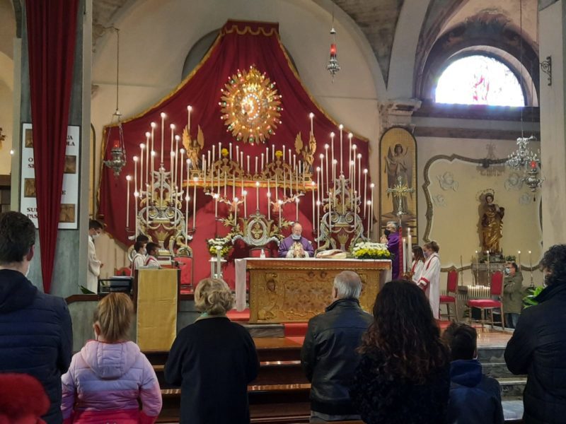 Con i vespri cantanti del pomeriggio di domenica 7 marzo si sono concluse nella parrocchia di San Giacomo a Cirano (frazione di Gandino) le giornate del Triduo dei Morti. Le celebrazioni, guidate dal parroco don Innocente Chiodi e da don Fiorenzo Rossi (coadiutore a Cene e Fiirano al Serio) si sono svolte ai piedi della Raggiera, che ai fedeli più anziani ha ricordato le preghiere eucaristiche di mezzo secolo fa nell’originaria parrocchiale. La chiesa fu poi gravemente danneggiata dal crollo del campanile nel 1968 e in seguito riedificata. Fu inaugurata, su disegno di don Pino Gusmini, dal Vescovo mons.Clemente Gaddi nel 1975. La Raggiera è parte centrale di un allestimento che comprende anche le piramidi laterali provenienti dalla chiesa di Santa Croce a Gandino (là utilizzate per le Quarantore) ed alcune parti accessorie realizzate dallo scultore locale Loverini. Le celebrazioni sono state accompagnate dalla Scuola di Canto parrocchiale. Nel prossimo fine settimana il “tour” delle Raggiere in Val Gandino si concluderà nella parrocchia di San Giovanni Battista a Casnigo, dove è già montato l’imponente apparato ligneo creato dai fratelli Bugada.
