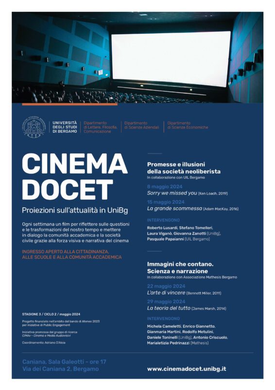 Cinema Docet è un’iniziativa promossa dal gruppo di ricerca CiMAv – Cinema e Media Audiovisivi dell’Università degli studi di Bergamo. Tutte le proiezioni sono gratuite senza necessità di prenotazione e si svolgono alle ore 17 nella Sala Galeotti della sede di via dei Caniana, 2 dell’Università degli studi di Bergamo.