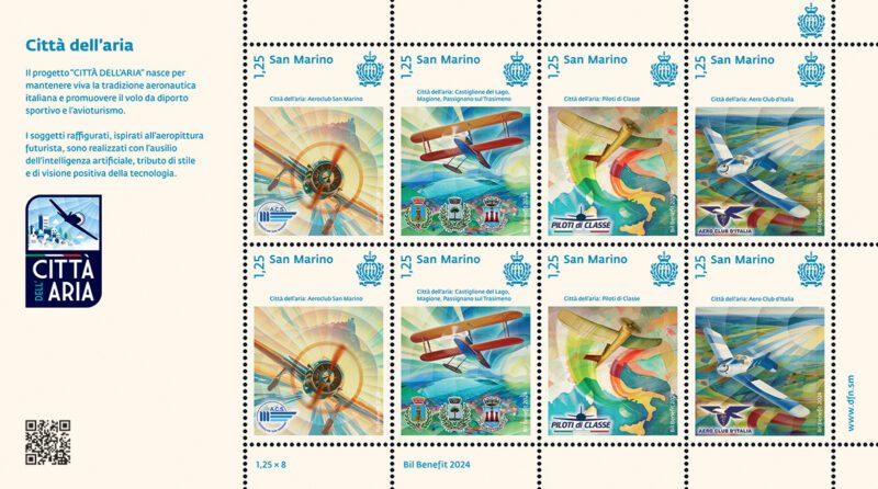Il quarto valore riproduce una veduta di una pianura italiana sorvolata da un velivolo e in basso il logo dell’Aero Club d’Italia (a completare il valore “1,25”, “San Marino”, lo Stemma della Repubblica, la legenda “Città dell’aria: Aero Club d’Italia”, il nome del bozzettista e l’anno 2024).