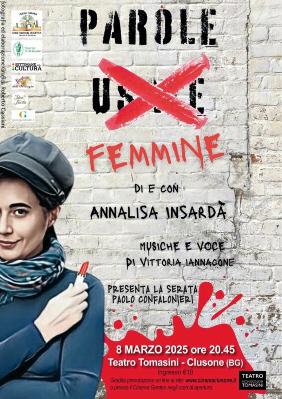 Sabato 8 marzo 2025, in occasione della Giornata Internazionale della Donna, il Teatro Mons. Tomasini di Clusone ospiterà Annalisa Insardà con il suo monologo “Parole Femmine”. Uno spettacolo intenso che parte con toni irriverenti e dissacranti per poi toccare corde profonde ed emozionanti.