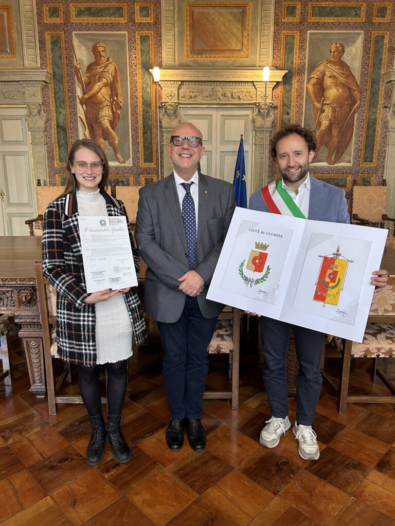 Nella mattinata di giovedì 6 novembre 2025, presso il Salone di Ulisse della Prefettura di Bergamo, si è svolta una cerimonia di grande significato per la comunità di Clusone. Il Prefetto Luca Rotondi ha ricevuto il Sindaco Massimo Morstabilini, accompagnato dall’Assessore alla Cultura e alle Politiche Giovanili Alessandra Tonsi, per la consegna ufficiale del Decreto con cui il Presidente della Repubblica ha concesso al Comune lo Stemma e il Gonfalone, insieme alle relative miniature.