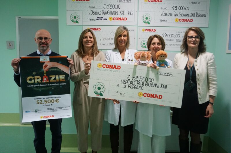 Conad Centro Nord ha devoluto 52.500 euro all’Ospedale Papa Giovanni XXIII. È il risultato di quanto raccolto da ottobre a fine dicembre 2024 nei punti vendita Conad delle province di Bergamo, Lecco e Sondrio a seguito dell’iniziativa solidale “I gesti d’amore si fanno sentire”. Il contributo raccolto da Conad Centro Nord sarà destinato a favore del Progetto Giocamico dell’ASST Papa Giovanni XXIII, percorso di sostegno psicologico ai pazienti più piccoli che dà supporto psicologico ai bambini e alle famiglie che devono affrontare percorsi diagnostici e terapeutici lunghi e complessi.