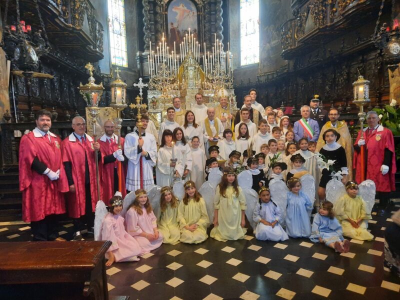 Un’intensa mattinata di preghiera unita ad un meteo ideale ha salutato domenica 11 giugno a Gandino la solenne processione del Corpus Domini, che dalla Basilica di Santa Maria Assunta ha attraversato il centro storico parato a festa con le tradizionali, multicolori zandaline. A presiedere la solenne concelebrazione e la successiva processione è stato mons.Maurizio Malvestiti, vescovo di Lodi, già a Gandino per il Corpus 2010. Al suo fianco c’erano il prevosto don Ferruccio Garghentini, i vicari don Giovanni Mongodi e don Manuel Valentini, don Franco Bertocchi. “Dire Corpus Domini – ha sottolineato mons.Malvestiti nell’omelia – significa ricordare la centralità di Gesù che viene fra noi nel suo Corpo e nel suo Sangue. Dirlo a Gandino fa memoria della devozione di tante generazioni, testimoniata da un apparato che in Basilica e fuori desta ammirazione e invita alla preghiera. Dobbiamo invocare la pace, perchè essa è la sintesi dei doni che Gesù elarigsce a tutti noi. Pace nel lavoro, nelle famiglie, nelle comunità e pace nel mondo, dove tanti sono i luoghi di sofferenza e odio, in situazioni dove coloro che sono definiti “i grandi della Terra” ne sono invece la sciagura”.