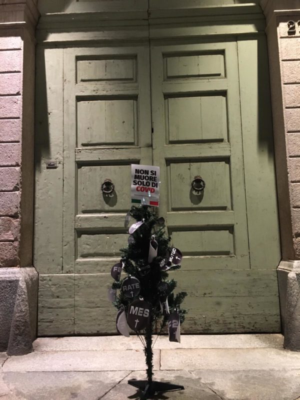 Nuova protesta delle Mascherine tricolori in tutta Italia tra cui anche la città di Bergamo. Fuori a numerosi Comuni in tutta Italia è stato lasciato un albero di Natale appositamente decadente, addobbato con diversi cartelli recanti le scritte ‘mutuo’, ‘affitto’, ‘bollette’ e ‘tassa rifiuti’ e lo slogan “non si muore solo di Covid” per evidenziare gli unici e veri regali che troverà il popolo italiano: pagamenti che non conoscono covid, quarantene e dpcm vari.