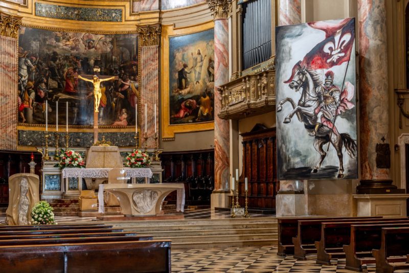 Una tela enorme (ben cinque metri d’altezza), per rappresentare il patrono della Città di Bergamo e ricordare nel contempo il duro periodo della pandemia. In coincidenza con la festa liturgica di S.Alessandro del 26 agosto, l’artista seriano Ivano Parolini (nativo di Gandino e residente ad Orezzo di Gazzaniga) propone nella Basilica di S.Alessandro in Colonna a Bergamo il ritratto trionfale del santo.
