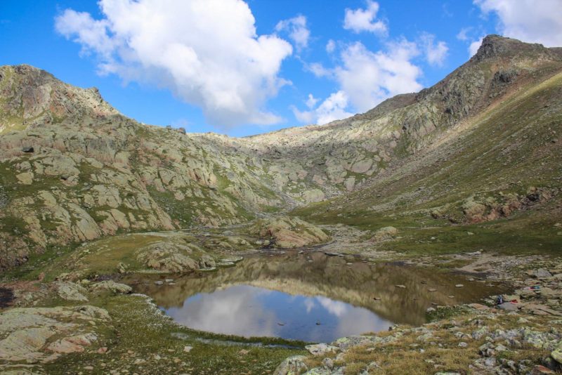 Abbiamo raggiunto il bivacco in circa 2 ore. Il percorso è ricco di percorsi d’acqua e alterna tratti dove si cammina tra gli arbusti in un bosco quasi fitto ad altri in cui si procede sulle rocce spoglie. La pendenza non è mai eccessiva. Dal bivacco i segnavia indicano ore 1.10 per raggiungere il Lago di Pietrarossa. Riprendiamo a salire in modo abbastanza ripido su un sentiero a zig-zag con alcune serpentine tra pietre, spuntoni di roccia ed erba. Al termine della salita raggiungiamo un grande ometto (pila di sassi di dimensioni differenti) e davanti si apre la conca nella quale si adagia il lago. Siamo a 2.601 metri sul livello del mare e abbiamo percorso 1.080 metri di dislivello. Tempo di percorrenza effettivo: ore 2.40. Lo specchio d’acqua è circondato da fiori bianchi e riflette sia le vette delle montagne che lo circondano sia l’azzurro del cielo. Il silenzio quasi tombale regala un’esperienza immersiva nella natura facendoci sentire quasi un tutt’uno con la montagna. Vale la pena fermarsi, chiudere gli occhi e respirare. Il panorama regala emozioni intense sia che lo sguardo sia rivolto verso il laghetto, sia osservando la valle alle nostre spalle. Difficoltà della camminata: 6.