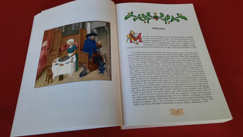 “Accanto al “Livre pour l’enseignement de ses filles” redatto nello stesso periodo (1371) dal nobile angioino Geoffrey de La Tour Landry – spiega Pietro Gelmi – il Ménagier è considerato il più famoso trattato medievale sull’educazione delle donne. Seguendo il modello di un trattato giuridico o di una summa teologica, è diviso in “sezioni” a loro volta suddivise in “articoli”. È composto da tre parti: la prima, contenente nove articoli, tratta della condotta e dei doveri di una sposa cristiana, la seconda, con i suoi cinque articoli, presenta le responsabilità di una padrona di casa e la terza è dedicata agli svaghi. Questa avrebbe dovuto comprendere tre articoli, ma purtroppo ne resta uno solo, dedicato alla caccia con lo sparviero. È nella seconda “sezione” che si può trovare un’infinità d’informazioni molto preziose sulla vita quotidiana, fra l’altro (e ampiamente) sulla cucina del tempo”.