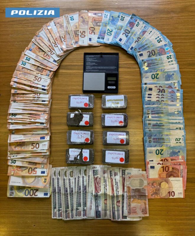Gli agenti hanno seguito l’uomo, il quale, è entrato all’interno della propria abitazione in Via Arquà, dove all’interno i poliziotti hanno rinvenuto 830 grammi di hashish, 5100 euro e 3615 pound egiziani.