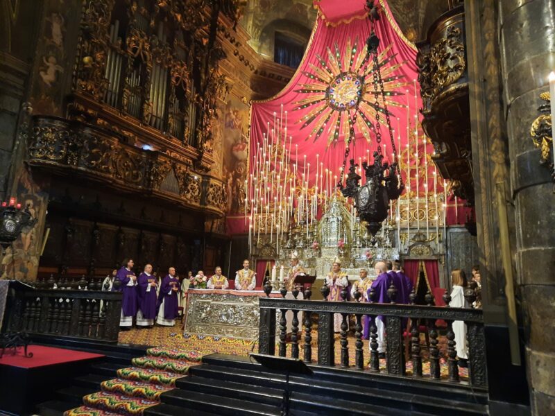 Una tradizione di fede che illumina il cammino di una comunità, ma anche un’occasione per riflettere davanti al mistero della morte, alla luce della grande Raggiera settecentesca dei maestri Caniana. Centinaia di fedeli hanno gremito la Basilica di Santa Maria Assunta a Gandino nei tre giorni del Sacro Triduo dei Morti. Lunedì 6 marzo, giornata di chiusura, la solenne concelebrazione mattutina è stata presieduta da mons. Maurizio Gervasoni, bergamasco di Sarnico, Vescovo di Vigevano dal 2013. Al suo fianco l’arcivescovo gandinese mons. Paolo Rudelli, già Osservatore della Santa Sede al Consiglio d’Europa a Strasburgo e, dal 2020, Nunzio Apostolico nello Zimbabwe. La messa è stata concelebrata da don Ferruccio Garghentini, prevosto di Gandino dallo scorso settembre, e da sacerdoti nativi o che hanno prestato servizio negli anni a Gandino. Sull’altare c’erano il vicario don Giovanni Mongodi, i gandinesi don Franco Bertocchi e don Carlo Caccia (parroco di Credaro), mons. Andrea Paiocchi (a Leffe dal 2016), don Innocente Chiodi (parroco di Bariano e già prevosto a Gandino dal 2010 al 2022), don Massimo Locatelli (parroco di Treviolo e curato a Gandino dal 1994 al 2011), don Giuseppe Merlini (parroco di Leffe e moderatore della Fraternità 3), don Alberto Gervasoni (parroco di Peia), don Egidio Rivola (parroco di Cazzano S.Andrea), don Massimo Cornelli (arciprete a Casnigo). La concelebrazione è stata accompagnata dalla Schola Cantorum Luigi Canali, diretta dal maestro Marco Guerinoni. “Le celebrazioni del Triduo – ha sottolineato mons. Gervasoni nel corso dell’omelia – devono innanzitutto ricordarci come l’eterno Amore di Dio sia il centro della nostra fede. Non siamo l’origine di noi stessi e per questo non siamo nemmeno padroni della nostra fine. Viviamo un’epoca in cui la cultura dominante vive la morte con fastidio, ritenendola un fatto privato. Il diffondersi della pratica della cremazione fa sì che vengano recisi legami forti di socialità e ricordo, che uniscono le persone e le generazioni. Personalmente ho dovuto discutere con i familiari di un mio sacerdote defunto affinchè si potesse celebrarne in chiesa il funerale. Si pensa alla morte come ad un fatto estremamente privato: le urne cinerarie dovrebbero essere conservate in un luogo pubblico ed invece, come consente la legge, sono nella disponibilità dei parenti del defunto. Essi, in un tempo non lontano, finiranno forse per dividersi non soltanto l’eredità ma anche le ceneri stesse. Tutto ciò è una distorsione pericolosa e il Triduo, tanto caro alla tradizione di fede di chi ci ha preceduto, è occasione per comprendere appieno il significato della morte e, soprattutto, dare un senso diverso alla vita di ciascuno”.
