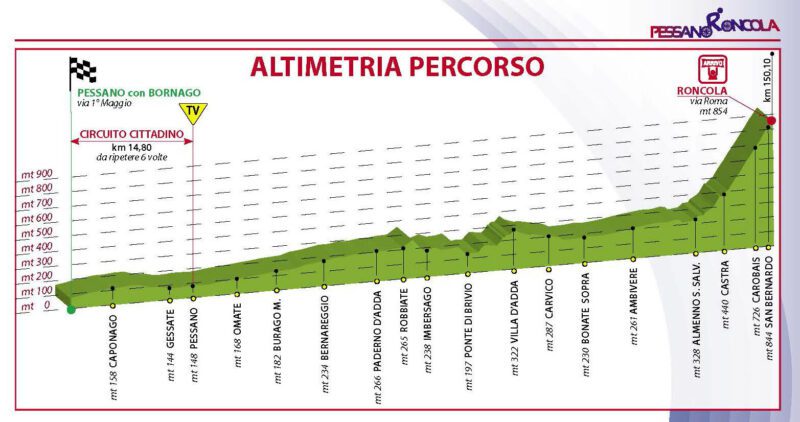 Confermato il percorso con il finale della passata edizione: dopo aver affrontato i sei giri iniziali pianeggianti di 15,2 km l’uno, nei pressi di Pessano con Bornago, e poi il tratto in linea che porta nella provincia di Bergamo, i corridori affronteranno la Strada Provinciale 172 da Almenno San Salvatore (attraversando le località di Castra e Carobais) per arrivare in cima alla salita della Roncola dal versante più duro. La corsa misurerà complessivamente 150,1 km.