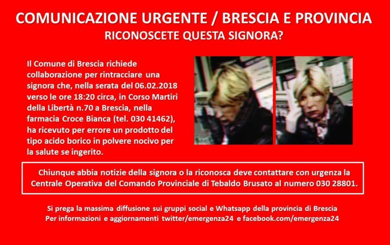 Il Comune di Brescia richiede collaborazione per rintracciare una signora che, nella serata del 06.02.2018 verso le ore 18:20 circa, in Corso Martiri della Libertà n.70 a Brescia, nella farmacia Croce Bianca (tel. 030 41462), ha ricevuto per errore un prodotto del tipo acido borico in polvere nocivo per la salute se ingerito.