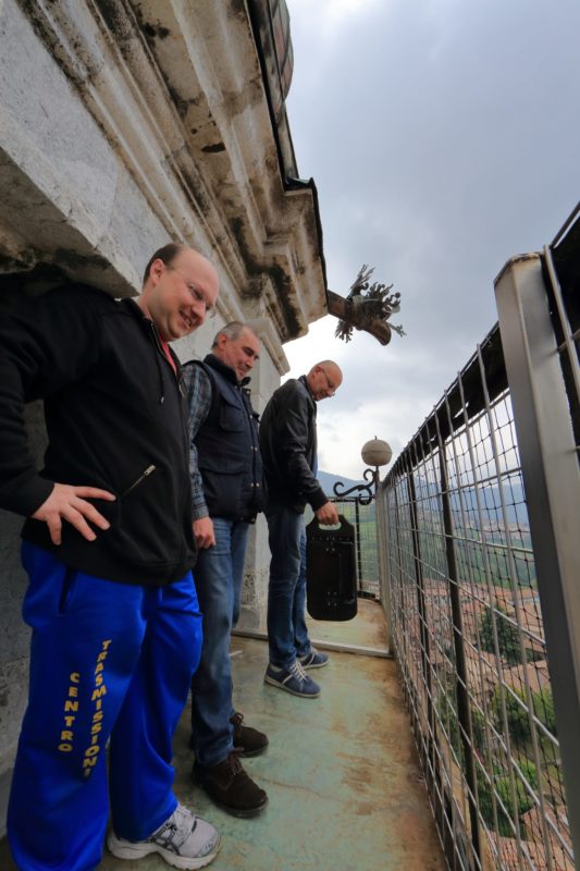 A Gandino la pandemia e le relative disposizioni non hanno fermato due tradizioni che da sempre accompagnano la devozione popolare locale. La mattina del Venerdì Santo, alle 7.30, con le campane necessariamente “legate”, si è aperto con “l’Ave Maria” l’impegno sul campanile della Basilica di due “urlatori”. Uno utilizza la propria voce (venerdì Fabio Rinaldi, sabato toccherà a Fulvio Masinari) e l’altro (quest’anno Emanuele Bertocchi) il suono della “tola” (una tavoletta in legno con battenti in ferro) per diffondere, in tutta la valle, il richiamo alla preghiera. Impossibilitato ad esserci Celestino Caccia (da decenni sul campanile con la tola) in quanto residente a Nembro. Oltre al richiamo mattutino, l’annuncio “urlato” dal campanile si ripete a mezzogiorno e alla sera alle 19 con “il Pater”. La tola viene scossa con forza a cadenza di passo, soffermandosi ad ogni angolo del campanile. L’ultimo giro di annuncio, detto “butì”, viene fatto suonando a raganella, cioè con ritmo continuato. Dall’alto dei 73 metri del campanile della Basilica, la loro opera ricorda lo stile dei muezzin visti probabilmente dai gandinesi sui minareti d’Oriente, in occasione dei viaggi portati a termine dai commercianti di pannilana.