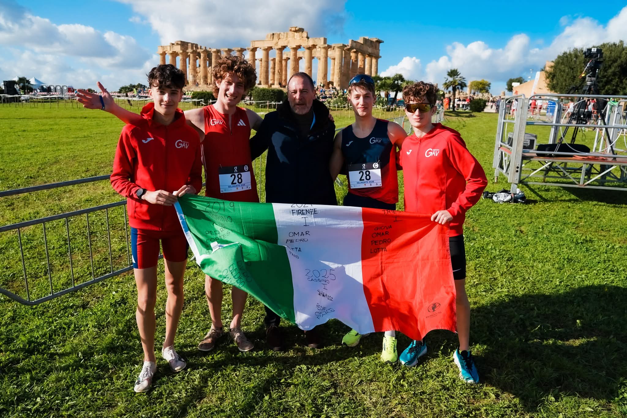 C’è il sigillo bergamasco del GAV Vertova nel sabato inaugurale della Festa Nazionale del Cross in corso di svolgimento a Selinunte (Trapani). Il Gruppo Alpinistico Vertovese) ha conquistato in campo maschile il quinto trionfo (in sei stagioni) nel Campionato Italiano Assoluto di staffette di cross. La gara ha seguito il format di quattro frazioni di 2 km ciascuna: un allievo come primo frazionista; un allievo o uno junior per il secondo giro; uno junior o un under 23 per la terza frazione; una promessa o un senior a chiudere. Ad indirizzare la gara per il verso giusto è stato da subito Luca Palamini, vicecampione italiano Allievi indoor, che ha passato il testimone da leader a Federico De Marchi. L’under 23 Omar Cattaneo ha mantenuto il vantaggio in terza frazione, mentre Sebastiano Parolini, forte del titolo europeo di dicembre, ha completato l’opera fermando i cronometri sul tempo complessivo di 24:25. Per il GAV Vertova è un pokerissimo memorabile, dopo le vittorie di Campi Bisenzio 2021, Trieste 2022, Gubbio 2023 e Cassino 2025: il denominatore dei cinque ori è la presenza di Omar Cattaneo, unico sempre al via in tutti i cinque quartetti tricolori della squadra diretta da Silvio Bosio. In campo femminile il GAV Vertova ha ottenuto un’eccellente quinta piazza con Chiara Valadè, Beatrice Guerini, Greta Cortesi e Alice Cortesi.Domenica 22 febbraio sono in programma le gare individuali e da subito, alle 9 sarà la volta del Cross Corto assoluto, con Sebastano Parolini, Alessandro Lotta ed Omar Cattaneo particolarmente attesi.La Festa del Cross di Selinunte sarà trasmessa in diretta streaming su www.atleticaitaliana.tvFoto Granata/FIDAL