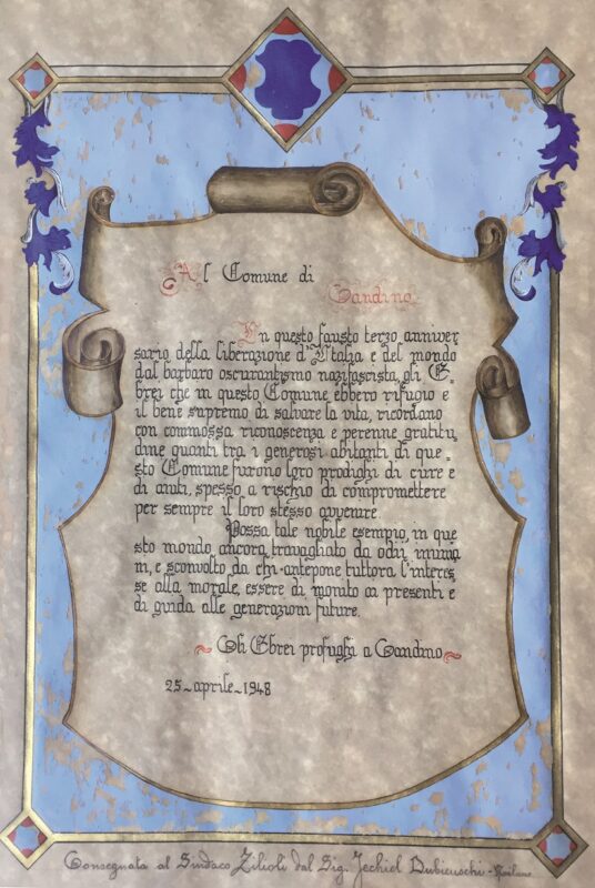 Esattamente settant’anni fa, nella primavera del 1948, gli Ebrei profughi a Gandino consegnarono all’allora sindaco Raimondo Zilioli, una pergamena preparata con cura e ricca di gratitudine. A consegnarla, il 25 aprile 1948 nel giorno dell’anniversario della Liberazione, fu Iechiel Dubiensky, che a Gandino aveva trovato riparo da esule ed avuto salva la vita.
