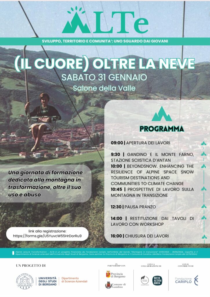 La giornata rientra tra le iniziative di divulgazione del progetto ALTe – Alpine Leisure Transformation, che ha come capofila l’Università degli Studi di Bergamo, in partnership con la Provincia di Bergamo e il Comune di Gandino, con il contributo di Fondazione Cariplo.