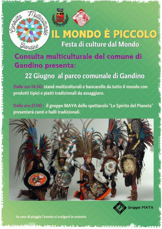 Un pomeriggio dedicato alla multiculturalità e alle specialità gastronomiche di ogni angolo del mondo ed uno spettacolo serale all’insegna dell’antica cultura Maya. La Consulta Multiculturale del Comune di Gandino organizza sabato 22 giugno l’iniziativa “Il Mondo è piccolo – Festa di culture dal Mondo”, che porterà in paese i temi che decretano da anni il successo de “Lo Spirito del Pianeta” attualmente in corso a Clusone.