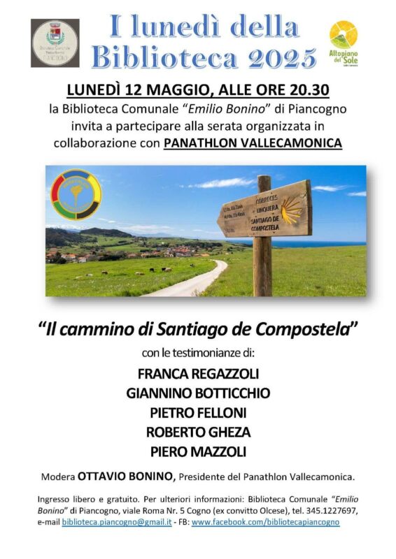 Lunedì 12 maggio 2025, alle ore 20:30, la Biblioteca di Piancogno ospiterà una serata speciale dedicata al celebre Cammino di Santiago de Compostela. L’evento, parte della rassegna “I lunedì della Biblioteca 2025”, è organizzato in collaborazione con il Panathlon Club di Vallecamonica.