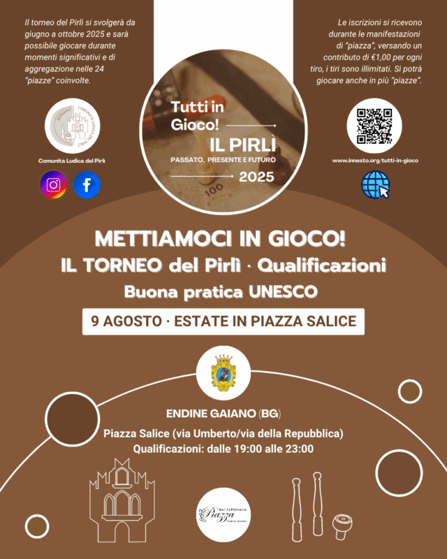 Il Torneo del Pirlì si inserisce all’interno di un progetto più ampio promosso dalla Cooperativa L’Innesto ONLUS con il sostegno di enti pubblici e privati, volto a valorizzare il patrimonio ludico immateriale rappresentato dal pirlì, antico gioco tradizionale che ha origini e radici profonde nella cultura popolare bergamasca e non solo. Il progetto, che include attività didattiche, laboratori, documentazione e momenti di festa, ha l’obiettivo di trasmettere questo gioco – e il suo valore – alle nuove generazioni.
