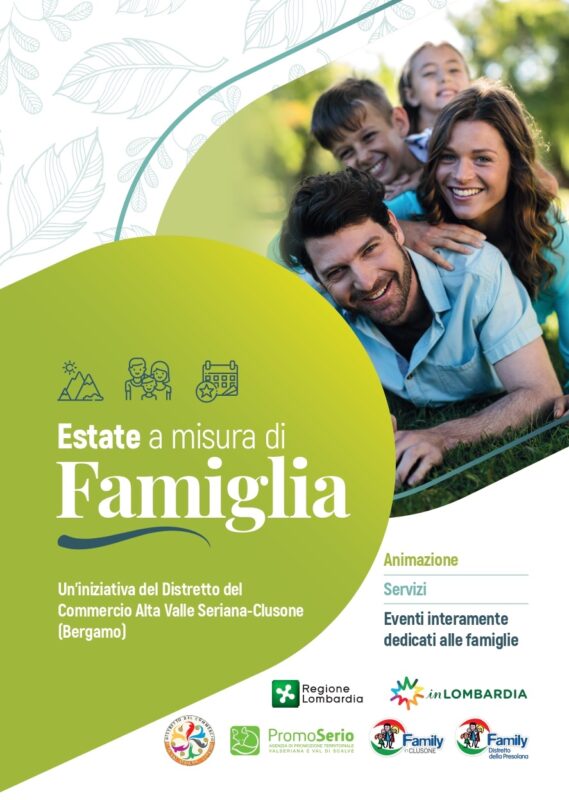Il concetto family è il tema portante delle iniziative sulle quali il Distretto lavora con il supporto di Promoserio, in collaborazione con le pubbliche amministrazioni e con i commercianti: in Alta ValSeriana si sono certificati i primi comuni “Amici della Famiglia” (del 2017 la certificazione dei Comuni di Cerete, Fino del Monte, Onore, Rovetta e Songavazzo) e qui è nata la prima Associazione “Family” del territorio. Il primo passo è uniformare le politiche di sostegno alle famiglie e di promozione dell’accoglienza delle famiglie a fini turistici con la certificazione, dopo l’ultima del 2022 al Comune di Clusone, anche per i Comuni del distretto non ancora certificati.