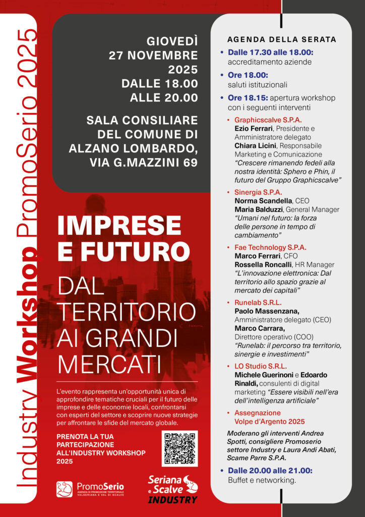 Novembre 2025È in programma giovedì 27 novembre la nuova edizione di “Industry Workshop 2025”, appuntamento promosso e organizzato da Promoserio per approfondire alcune delle tematiche cruciali legate al futuro delle imprese e delle economie locali, confrontarsi con esperti del settore e scoprire nuove strategie per affrontare le sfide del mercato globale. Rivolto ad aziende, amministratori locali e operatori turistici, l’evento – che si terrà alle ore 18:00 presso la Sala Consiliare del Comune di Alzano Lombardo – volge lo sguardo sul futuro delle imprese trattando il tema “Dal territorio ai grandi mercati”.