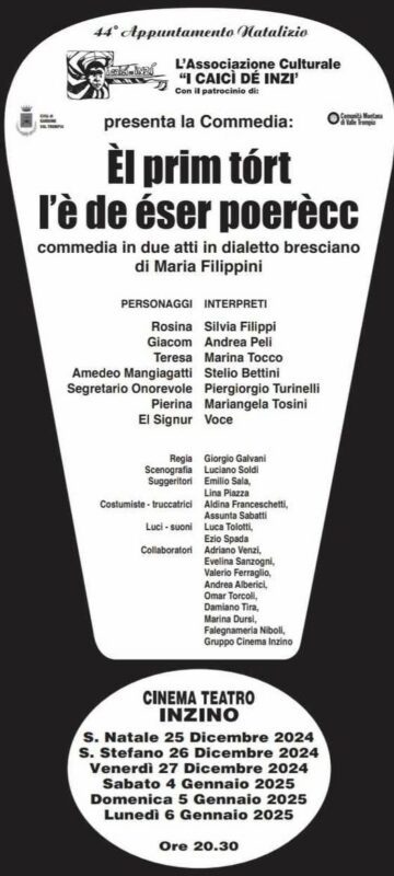 L’Associazione Culturale “I Caìci dé Inzì” presenta, con il patrocinio del Comune di Gardone Val Trompia e della Comunità Montana di Valle Trompia, la commedia in due atti in dialetto bresciano “Èl prim tórt l’è de éser poerècc”, scritta da Maria Filippini.