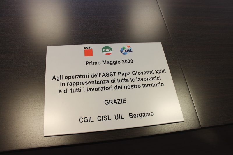 E’ stata consegnata ieri alla Direzione strategica del Papa Giovanni XXIII una targa in alluminio donata dalle sigle sindacali CGI, CISL e UIL all’ospedale simbolo dell’emergenza Covid-19 in Italia.