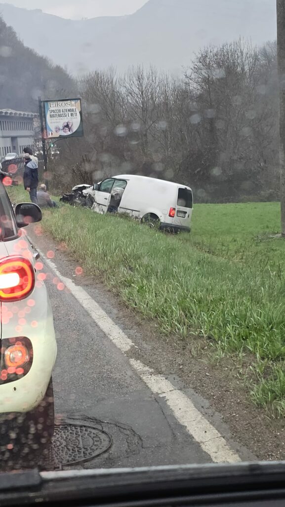 Forse dopo uno scontro frontale, un furgone è uscito dalla carreggiata finendo nel campo a lato della strada. Nell’impatto il mezzo ha riportato danni evidenti alla parte anteriore.