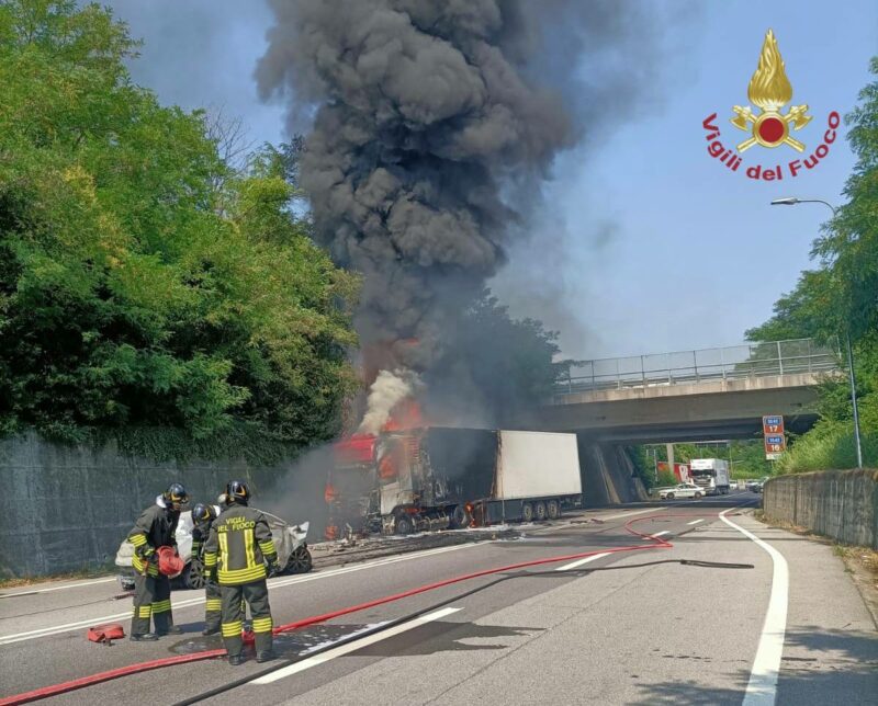I Vigili del fuoco della Centrale di Bergamo, il distaccamento di Dalmine e i volontari di Gazzaniga intervengono per un incidente stradale tra una vettura e un camion rimorchio sulla SS42 Ovest a Brusaporto intorno alle 15:15. Un morto. I VVF spente le fiamme hanno messo in sicurezza i mezzi.In supporto anche i volontari di Romano di Lombardia