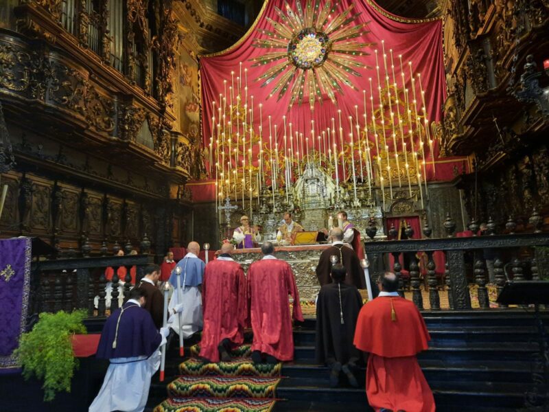Dopo l’incontro nella chiesa di San Mauro presso il Convento delle Orsoline, il corteo processionale con decine di Confratelli in divisa ha raggiunto la Basilica per la messa presieduta dal prevosto don Ferruccio Garghentini. Quello del Triduo è un momento liturgico molto sentito, espressione di una tradizione particolarmente diffusa in Valle Seriana, che a Gandino vive una suggestione di grande impatto. A caratterizzare l’allestimento è la Raggiera lignea che si erge dietro l’altare maggiore. L’enorme incastellatura creata dai Caniana tocca i dodici metri di altezza e vede il Santissimo coronato da raggi con vetri policromi di Murano illuminati da lampadine elettriche (un tempo lumini) secondo un’iconografia che richiama la visione dantesca di Dio.