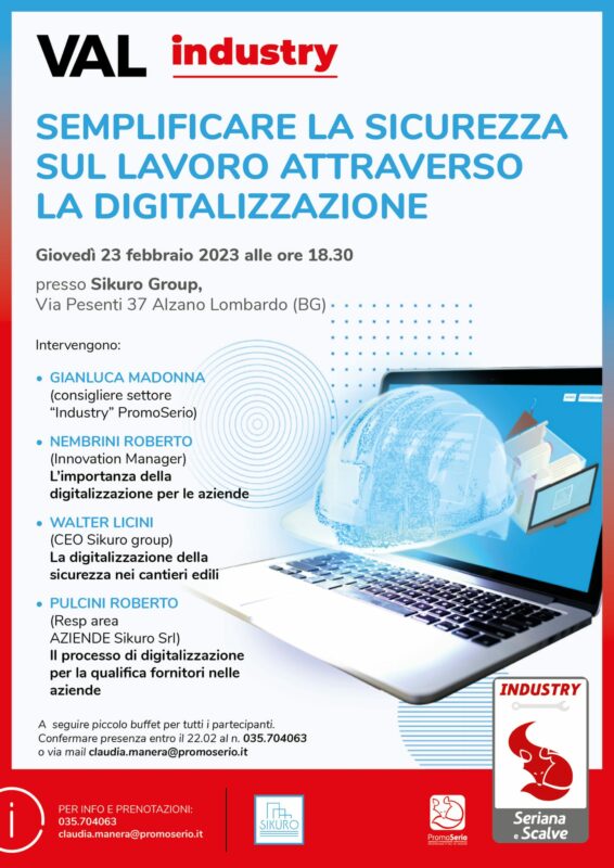 Per approfondire questi temi, il settore Industry di Promoserio organizza un nuovo appuntamento con le imprese dal titolo “Semplificare la sicurezza sul lavoro attraverso la digitalizzazione”. L’incontro si terrà giovedì 23 febbraio alle 18.30 presso la società di consulenza sulla sicurezza Sikuro Group.