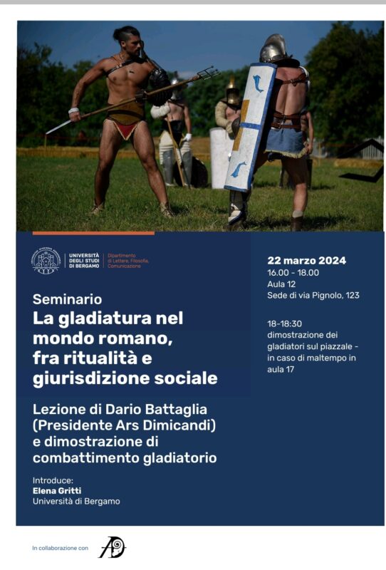Una piccola ma avvincente lezione di storia che smonta gli stereotipi cinematografici e ricostruisce con dovizia di fonti l’autentica funzione della gladiatura, sotto la guida del Presidente di Ars Dimicandi, Dario Battaglia che, nell’incontro di venerdì 22 marzo alle ore 16:00 presso la sede UniBg di via Pignolo, 123, condurrà gli studenti e i cittadini nel mondo dei munera gladiatori, spiegando la tipologia di armi e armature, oltre al significato dei combattimenti nei contesti funerari.